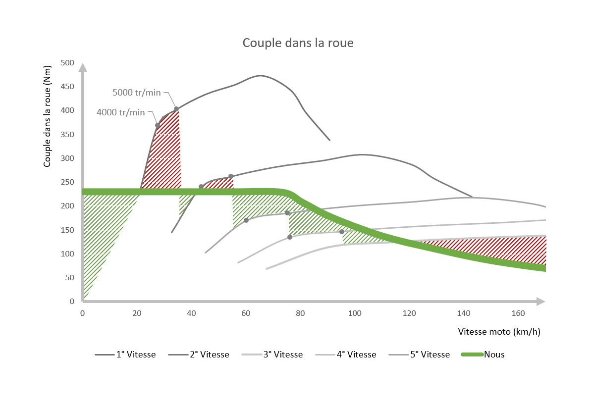 Et pour le plaisir, voilà une comparaison du couple dans la roue de notre moto et celui de la MT-03 lorsqu’on passe les rapports dès qu’on atteint 5 000 tr/min :