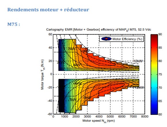 Enfin pour être précis, il a trouvé l’évolution du rendement de l’ensemble moteur + réducteur de la Twizy version 2012. Le rendement qu’on peut y voir est donc doublement sous-estimé :