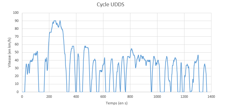 Dans notre cycle UDDS, c’est assez simple. D’ailleurs, on peut observer que l’intérêt de ce cycle repose dans sa fréquence assez généreuse en accélérations et en décélérations, ce qui est bien plus représentatif de la réalité que les autres cycles.