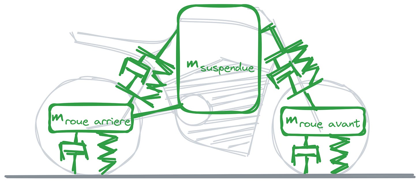Vous pouvez donc y retrouver la masse de la roue avant, de la roue arrière, et du reste de la moto, ainsi que les 4 ressorts (dessinés comme des zigzags) et les 4 amortisseurs (dessinés comme des pistons).